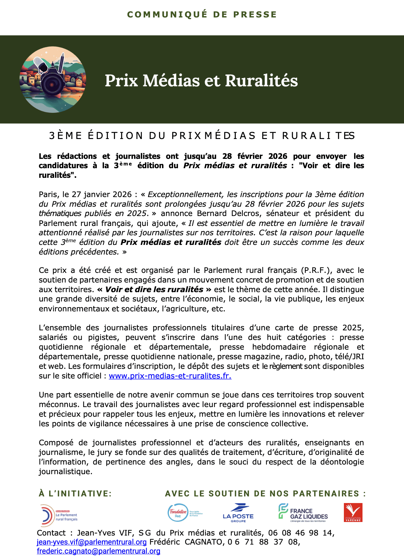 Les rédactions et journalistes ont jusqu’au 28 février 2026 pour envoyer leurs candidatures à la troisième édition du Prix médias et ruralités : « Voir